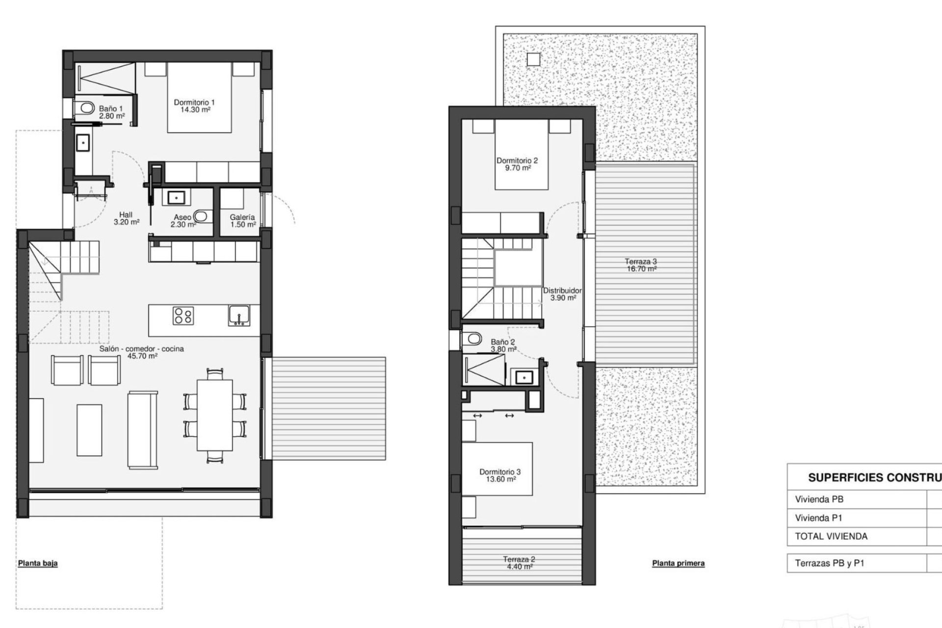 La cocina de concepto abierto se une al salón-comedor, creando un ambiente amplio, luminoso y conectado directamente con las zonas exteriores. El dormitorio principal incorpora vestidor y baño en suite, ofreciendo un espacio íntimo y confortable.